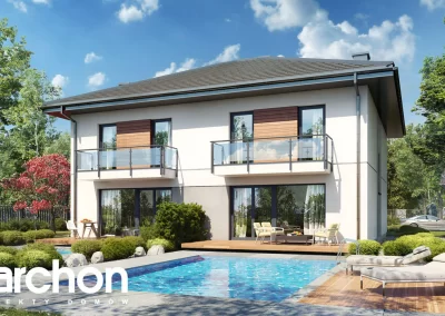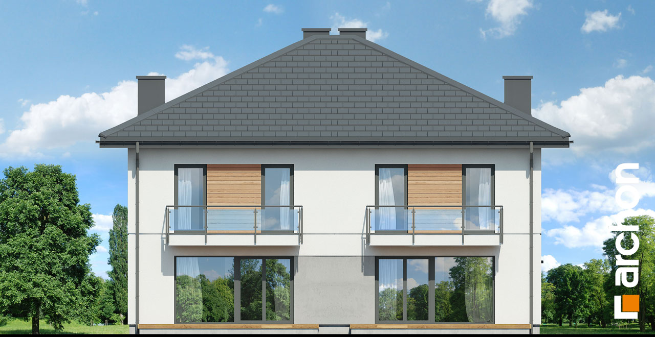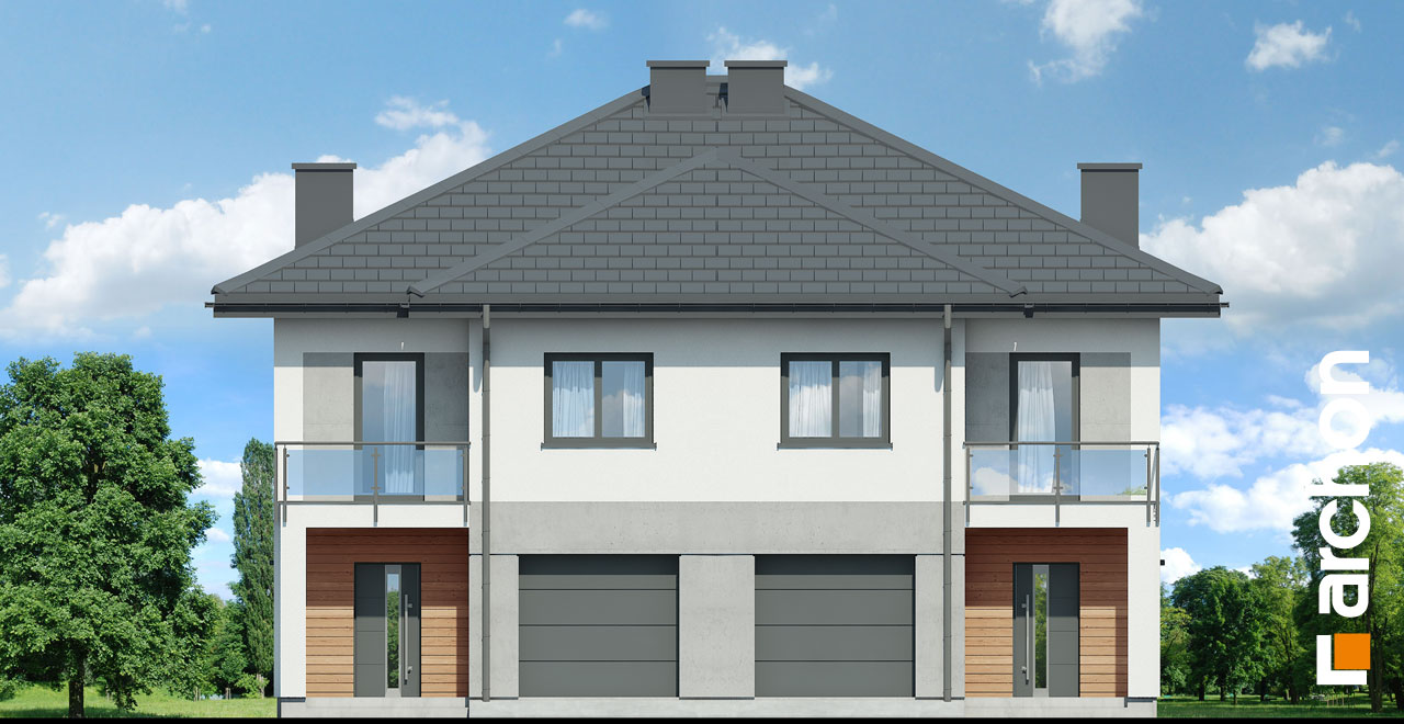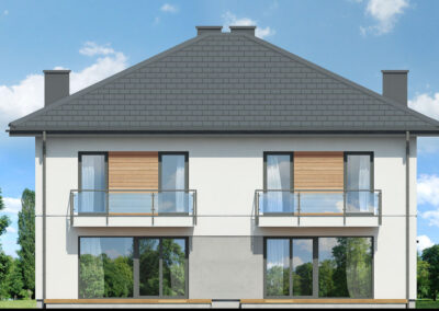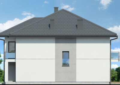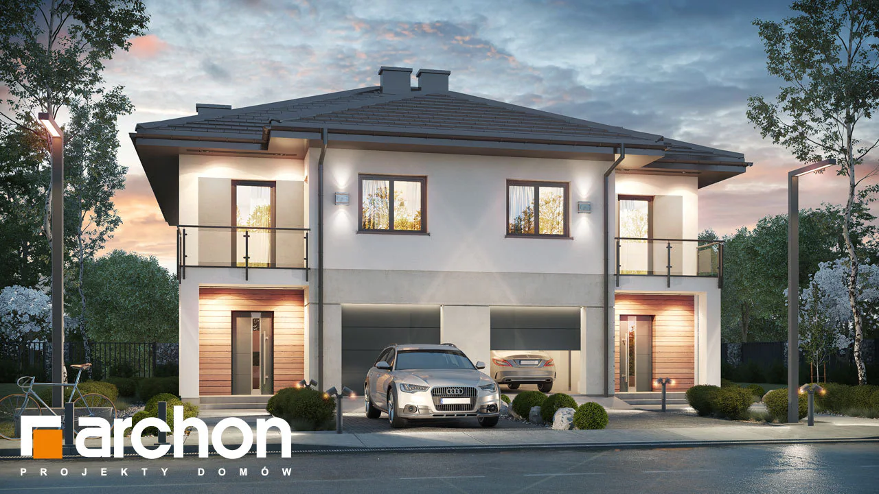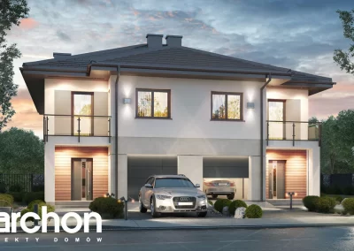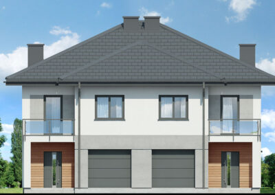 Interesujący projekt domu piętrowego do zabudowy bliźniaczej w stylu nowoczesnej willi. Przestronne wnętrze oferuje komfortowe warunki użytkowania, a wykończenie elewacji zachwyca wyjątkowym designem. Stonowana kolorystyka tynków pięknie współgra z grafitową stolarką, antracytową dachówką oraz naturalnym drewnem, którym zaakcentowano wybrane fragmenty elewacji. Mieszkańcy każdego segmentu dysponują jednostanowiskowym garażem, który w całości został wpisany w bryłę budynku. Osłonięta podcieniem strefa wejściowa prowadzi przez wiatrołap i hol do otwartej, dobrze doświetlonej strefy dziennej, której przestrzeń wypoczynkową uzupełnia dostępny z jadalni taras. Ustawna kuchnia posiada optymalny układ funkcji, a przewidziany w jej programie długi blat roboczy, oferuje także dodatkowe miejsce do jedzenia i wizualnie oddziela przestrzeń kuchni od pozostałej części strefy dziennej. W pobliżu wiatrołapu zaprojektowano toaletę, a obok niej kotłownię gazową. Przewidziana przy prowadzących na piętro schodach kompozycja roślinna z pewnością będzie atrakcyjną ozdobą wnętrza. Pełna wysokość drugiej kondygnacji zapewnia maksimum przestronności w strefie nocnej domu. Mieszkańcy mają tutaj do dyspozycji dużą sypialnię główną z wyodrębnioną garderobą oraz trzy pokoje dla dzieci. Wszystkie pokoje posiadają dostęp do balkonów. Na osi schodów znajduje się wspólna łazienka