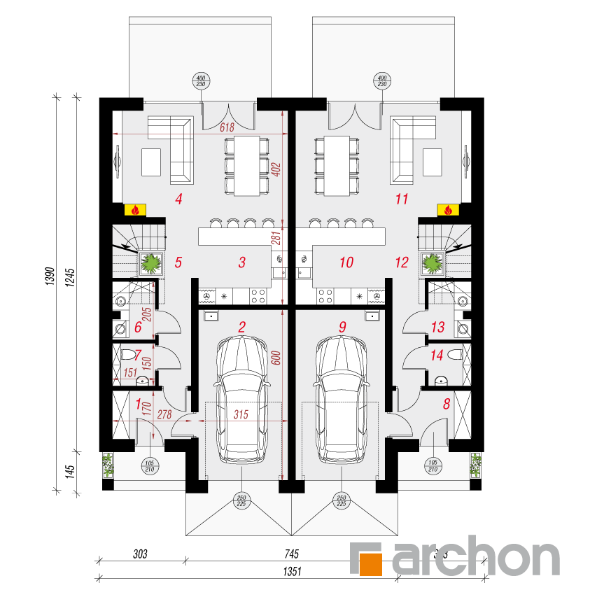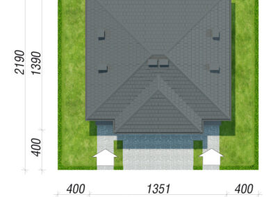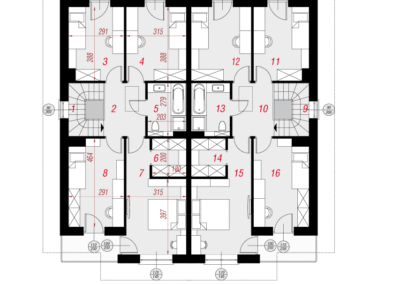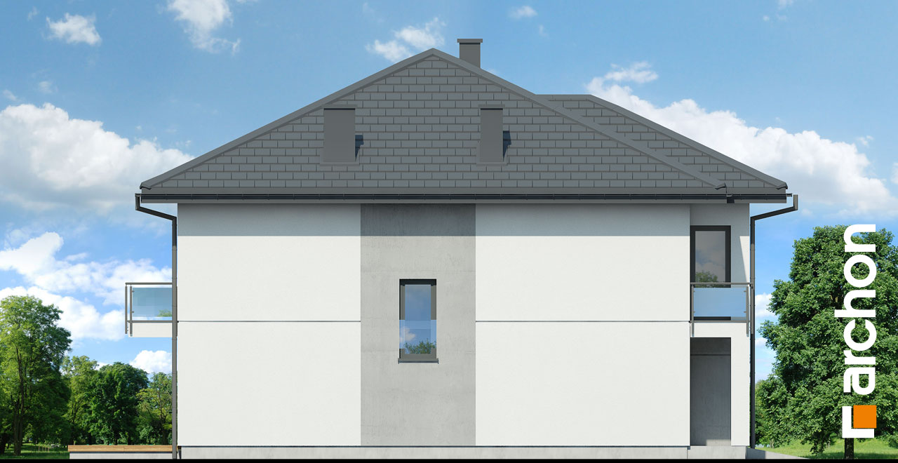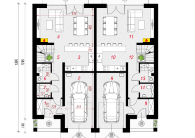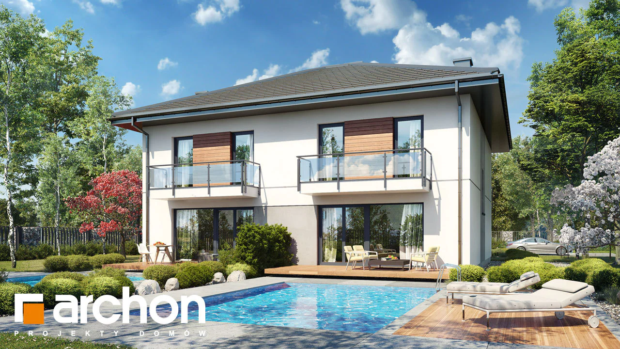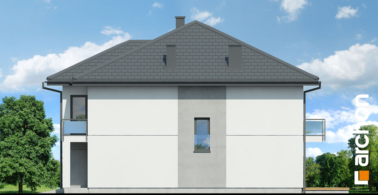 Interesujący projekt domu piętrowego do zabudowy bliźniaczej w stylu nowoczesnej willi. Przestronne wnętrze oferuje komfortowe warunki użytkowania, a wykończenie elewacji zachwyca wyjątkowym designem. Stonowana kolorystyka tynków pięknie współgra z grafitową stolarką, antracytową dachówką oraz naturalnym drewnem, którym zaakcentowano wybrane fragmenty elewacji. Mieszkańcy każdego segmentu dysponują jednostanowiskowym garażem, który w całości został wpisany w bryłę budynku. Osłonięta podcieniem strefa wejściowa prowadzi przez wiatrołap i hol do otwartej, dobrze doświetlonej strefy dziennej, której przestrzeń wypoczynkową uzupełnia dostępny z jadalni taras. Ustawna kuchnia posiada optymalny układ funkcji, a przewidziany w jej programie długi blat roboczy, oferuje także dodatkowe miejsce do jedzenia i wizualnie oddziela przestrzeń kuchni od pozostałej części strefy dziennej. W pobliżu wiatrołapu zaprojektowano toaletę, a obok niej kotłownię gazową. Przewidziana przy prowadzących na piętro schodach kompozycja roślinna z pewnością będzie atrakcyjną ozdobą wnętrza. Pełna wysokość drugiej kondygnacji zapewnia maksimum przestronności w strefie nocnej domu. Mieszkańcy mają tutaj do dyspozycji dużą sypialnię główną z wyodrębnioną garderobą oraz trzy pokoje dla dzieci. Wszystkie pokoje posiadają dostęp do balkonów. Na osi schodów znajduje się wspólna łazienka